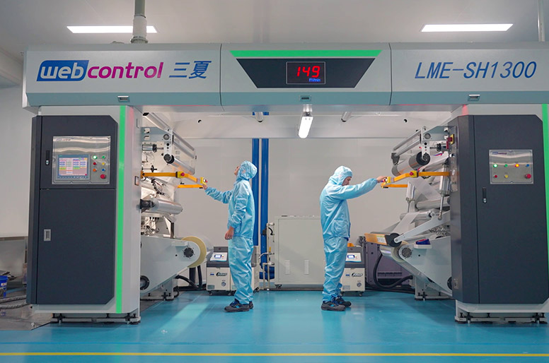 机械速度:450m/min;涂层宽度范围:650-1300mm;采用无轴收放卷技术,配备5辊式涂布系统与3辊式贴合系统,5段式张力控制系统,确保生产稳定。纠偏系统,提升生产精度,触控式人机界面,操作更为简便直观。
